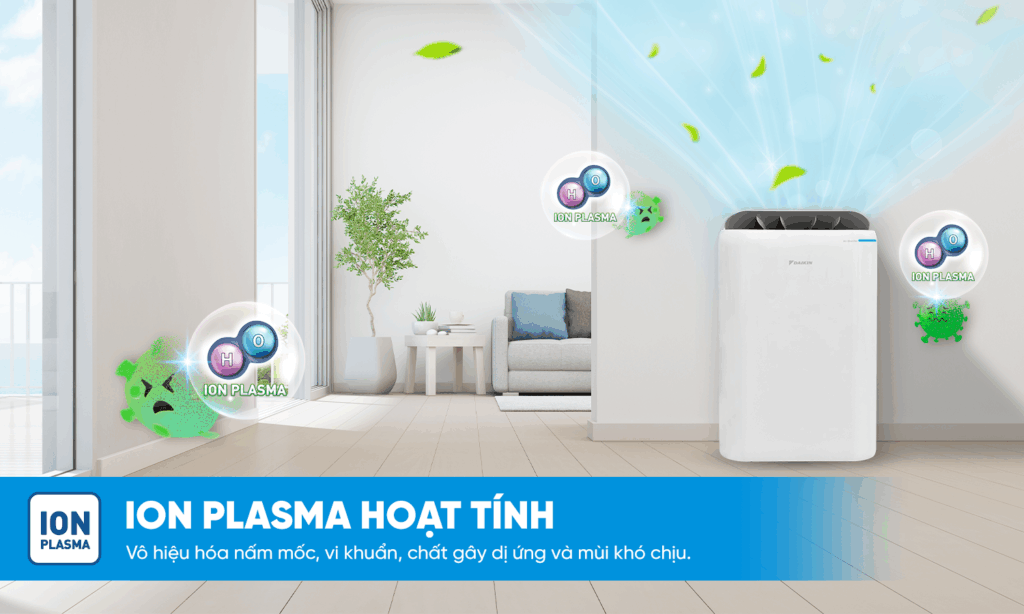 Máy được trang bị công nghệ Ion Plasma hoạt tính tiên tiến, giải phóng các ion với nồng độ cao (25.000 ion/cm³). Các ion này nhanh chóng kết hợp với các thành phần trong không khí tạo thành các gốc oxy hóa mạnh, có khả năng vô hiệu hóa nấm mốc, vi khuẩn, chất gây dị ứng và các mùi khó chịu. Nhờ đó, không gian sống của bạn luôn trong lành, sạch khuẩn và an toàn hơn.